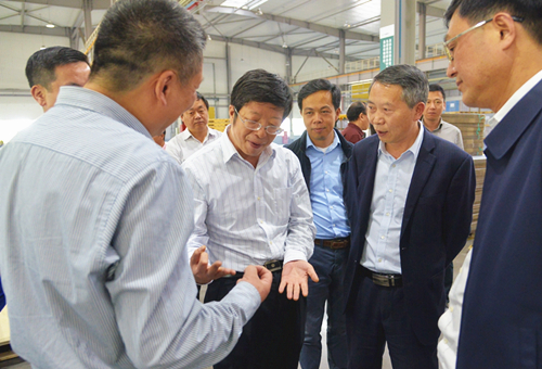 錢三雄一行深入生產車間現場,詳細了解企業發展情況。在參觀了生產流程及生產線后,錢三雄對巨美家科技致力于生產研發綠色、環保、可循環利用產品的舉措給予了充分肯定,并希望巨美家充分發揮人才和技術優勢,抓住發展機遇,在環保家居產品領域不斷提高市場占有率。