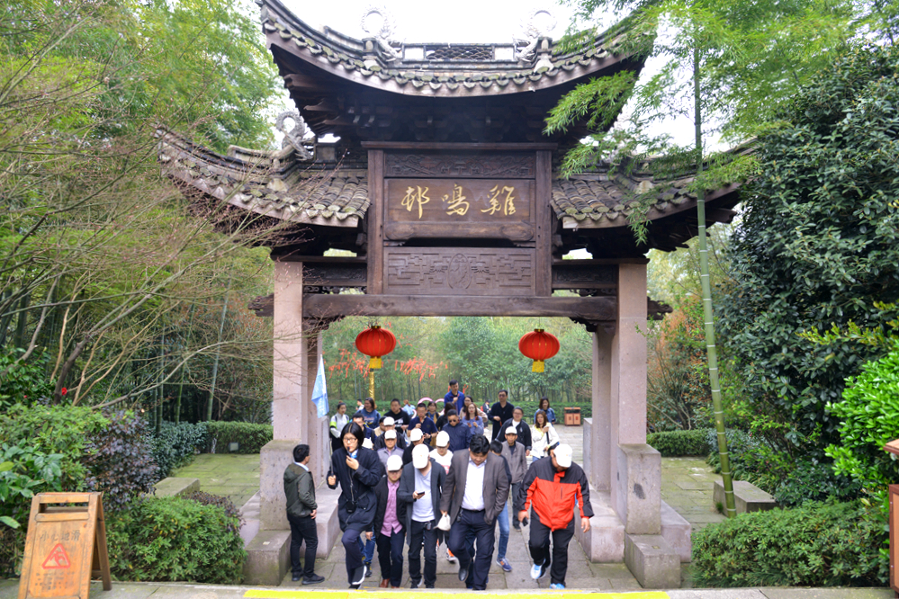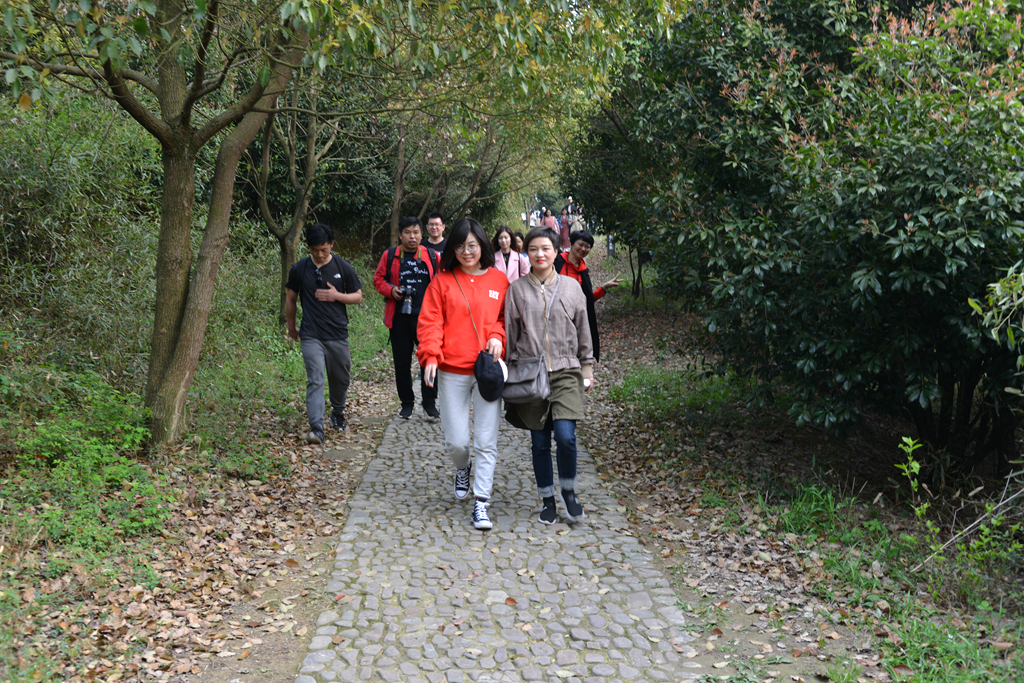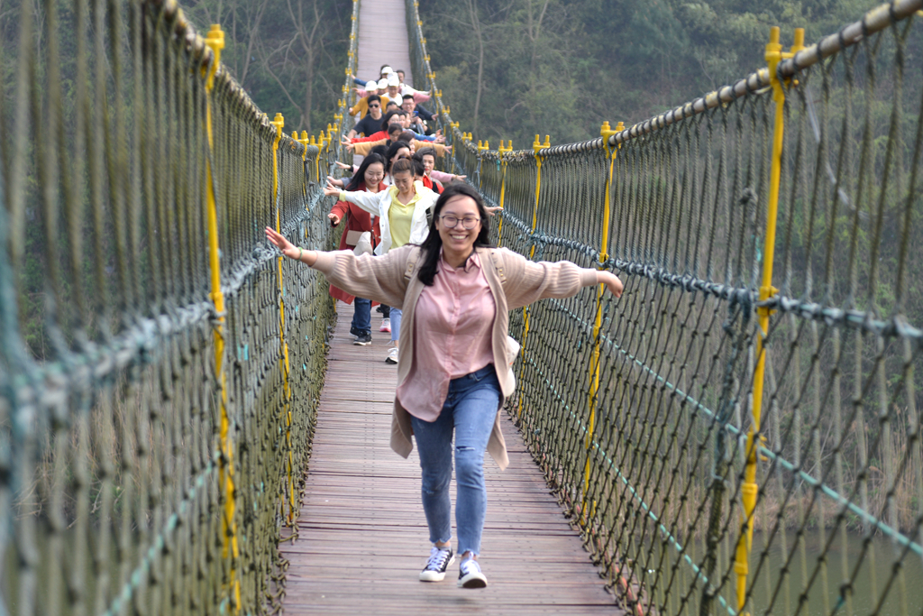 隨著如畫春色徐徐展開,一行人到達旅行的第一站,有著“天堂南山,夢幻竹海”美譽的溧陽南山竹海風景區。一望無際的毛竹倚山抱石,鏡湖巒影中的排排竹筏,山間徑旁的潺潺溪流和形態各異的竹木小屋,一派古樸、原始、自然的清新意境。蜿蜒的山路并沒有阻止大家向上的腳步,不畏攀登艱勞,努力跨越沿途障礙,收獲了諸多樂趣。