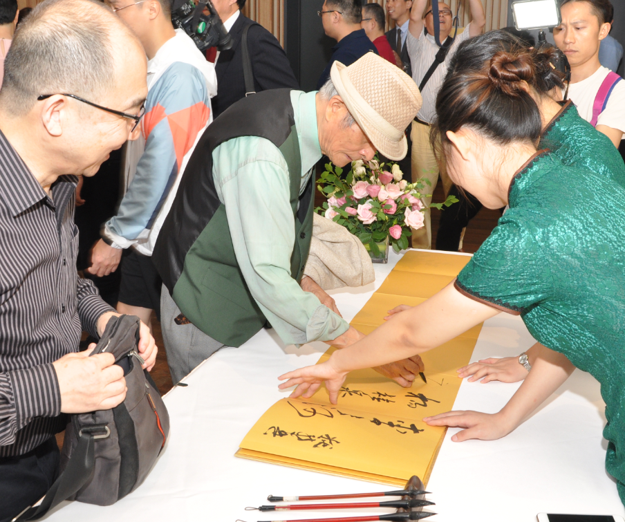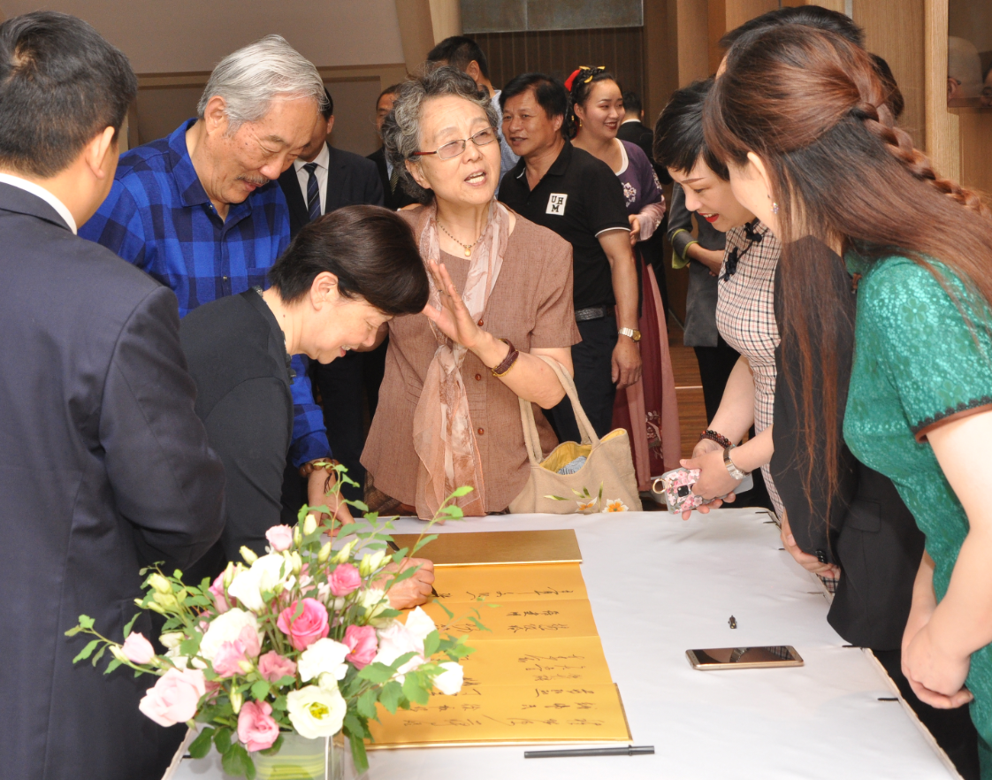 中共湖州市委常委、宣傳部部長范慶瑜宣布莊弘醒美術館開幕,江浙兩地的領導、藝術家與莊弘醒先生、巨人集團錢江董事長聯袂為開幕式剪彩并且合影。