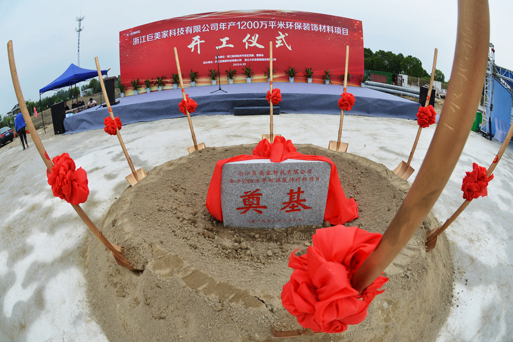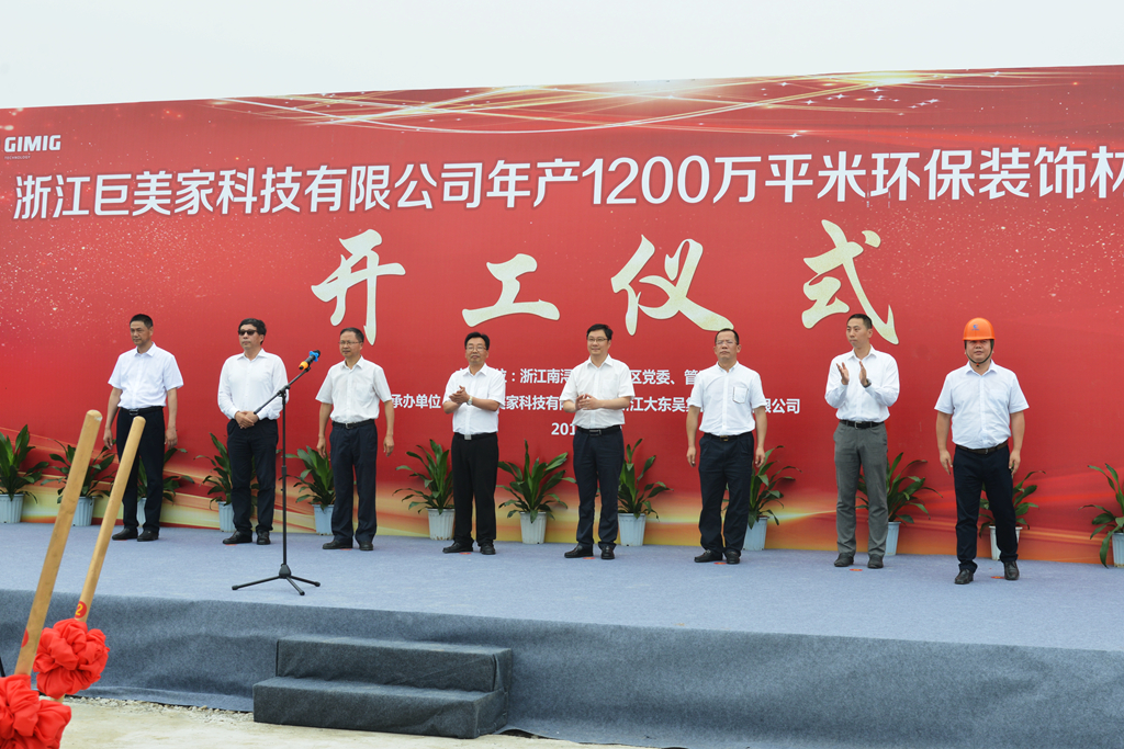 6月29日,由浙江南潯經濟開發(fā)區(qū)黨委、管委會主辦的浙江巨美家科技有限公司年產1200萬平環(huán)保裝飾材料項目開工儀式在巨美家新廠區(qū)現(xiàn)場隆重舉行。南潯區(qū)委書記夏堅定,區(qū)委常委、開發(fā)區(qū)黨委書記朱偉,區(qū)人大常委會副主任魏海松,開發(fā)區(qū)黨委副書記、管委會主任閔金良等黨政領導以及區(qū)級相關職能部門出席開工奠基儀式。巨人控股董事長錢江、巨美家董事長錢蘇醒、巨美家總經理錢偉民等公司領導及浙江大東吳集團建設有限公司總裁蒙二虎同時參加。