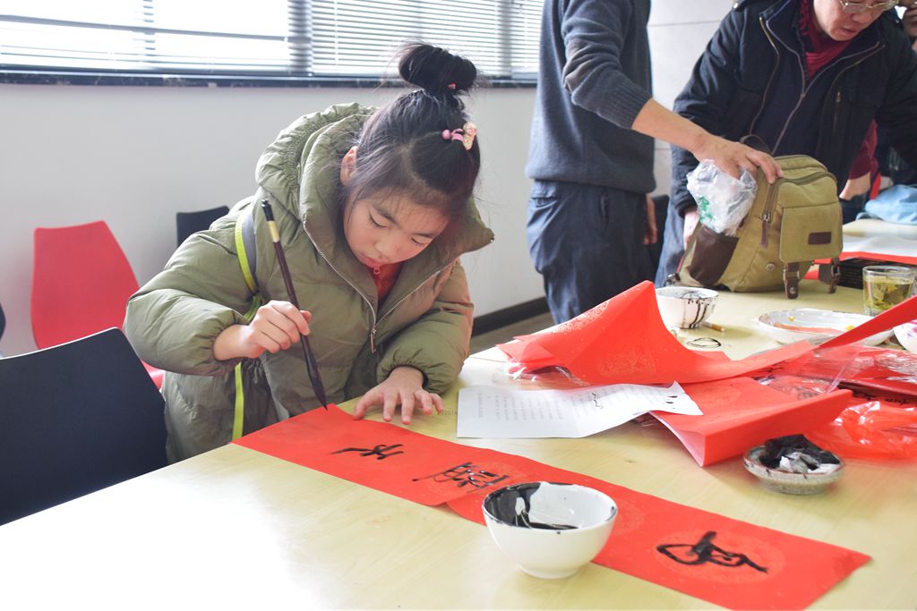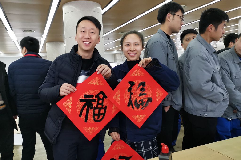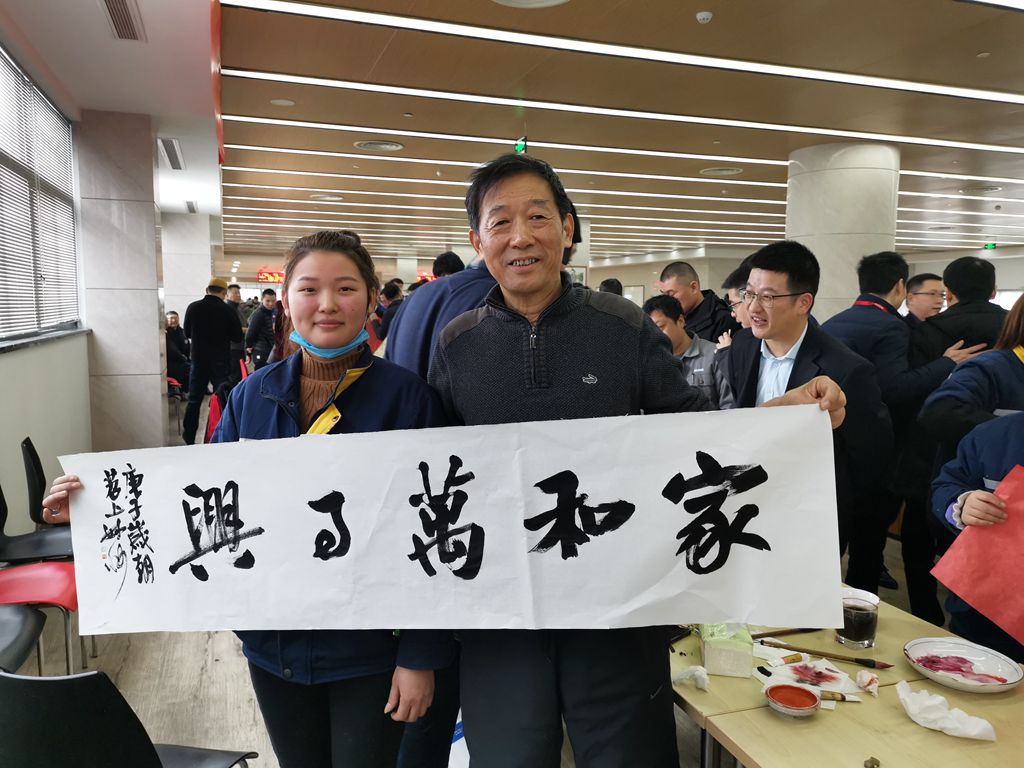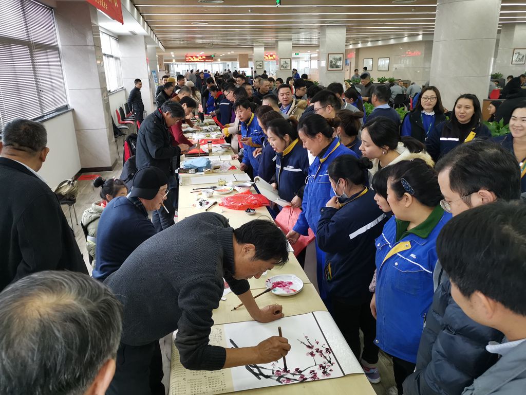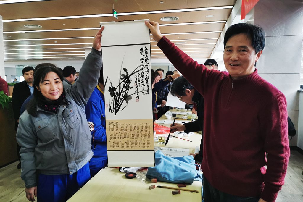 在員工們熱情洋溢的簇?fù)硐拢魑坏で喔呤直M情揮毫潑墨,一對(duì)對(duì)春聯(lián)并駕齊驅(qū),一句句祝福躍然紙上,字里行間充滿迎新納福的美好祝愿和書(shū)畫(huà)家們冬日里送來(lái)的暖意。員工們捧著一副副翰墨飄香的春聯(lián)和書(shū)畫(huà)作品,欣喜之情溢于言表,處處書(shū)寫(xiě)著除舊迎新的祥和氣象。
