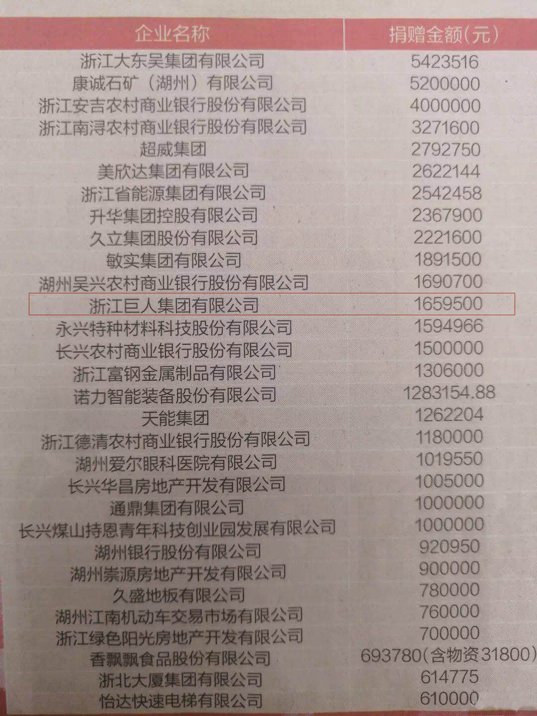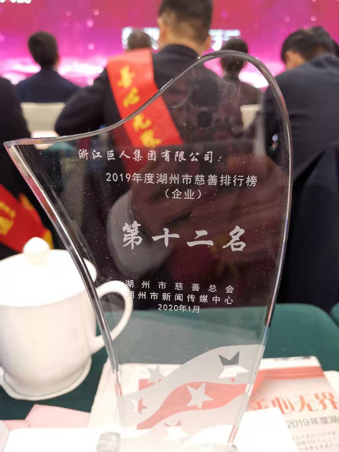 1月14日,由湖州市慈善總會和湖州市新聞傳媒中心共同主辦的湖州市第三屆慈善年會在湖州賓館隆重舉行,會上發布了2019年度“湖州市慈善排行榜”。浙江巨人集團有限公司名列第十二位,第三次榜上有名。