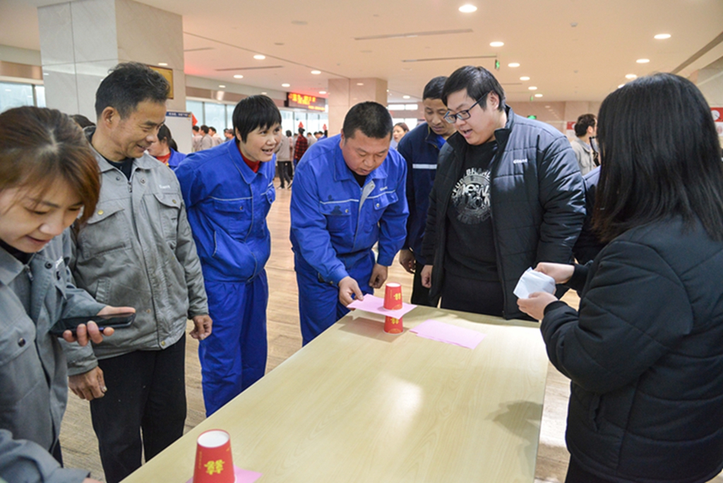 “加油、加油”,一片熱烈的應援聲中,“推推樂”拉開了活動序幕,大家緊盯著一聽飲料,只見它被參賽者從桌子一端推了出去,卻在離終點線毫厘之差的地方“踩了急剎”,惹得大家一聲嘆息。狀況百出的“抽抽樂”收獲了一片歡聲笑語,兩個紙杯中間的紅紙成為獲勝關鍵,員工們紛紛摩拳擦掌,躍躍欲試。“猜燈謎”作為活動重頭戲,現場更是人群涌動,字謎內容集知識性、趣味性和思考性于一體,吸引大家踴躍參與,員工們或低頭深思,或激情討論,猜中的員工展露笑容、興高采烈地兌獎,活動現場激情高漲。